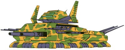 Unlike Zeon's Dobay, which is, by all regards and classifications, a giant tank, the Big Tray is propelled by an air cushion under its body, something like that of a twentieth century LCAC. Though it is quite heavy, the Big Tray is fully capable of amphibious operations, and is quite mobile for a unit of its size. Though it isn't very fast, it can navigate tough terrain easily. The Big Tray is intended for heavy attack; as such, it is armed primarily with large, powerful weapons. Two giant mega particle cannons are mounted on the Big Tray's front, designed for use against large land targets. Three triple-barreled cannons (modeled something after a battleship turret) are spread evenly across its hull, giving it very few blind spots. In a worst case scenario, the Big Tray can always simply crush anything trying to sneak up on it. Though it is primarily a fire support unit or utilized as a forward command post, the Big Tray carries two squadrons of aircraft and a handful of mobile suits inside its hangar below the rear turret. Much as with the Dobay, these take time to deploy, however, due to the cramped space. |