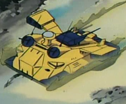 Earlier successes with the Dobay-class gave the Zeon an excellent heavy attack unit as well as a useful frontline command unit. However, its low mobility did not allow for rapid deployment or quick assaults. It was also as a loss compared to the Federation's Big Tray, which could cross water due to its use of an air cushion. Zeon engineers sought out to develop a new land battleship that would correct these flaws. The Gallop is much smaller than the Dobay, and is probably more deserving of the title "land cruiser" than anything else. It uses an air cushion much as the Big Tray, however, its main propulsion is provided by eight jet engines on external pylons, providing it with great speed and high acceleration. It trades these off for a light armament, however. Two heavy machineguns are mounted at the front of the Gallop, and a large double-barreled cannon is installed behind the observation tower. The Gallop relies more on its mobile suits to get the job done in combat. Two can be stored in a small hangar in the ship's front, ready to launch at a moment's notice. The large dome-shaped "trailer" at the back serves as the main hangar, where an additional two mobile suits as well as other units can be stored and maintainenced. The two parts of the Gallop can seperate and function independantly if needed. |