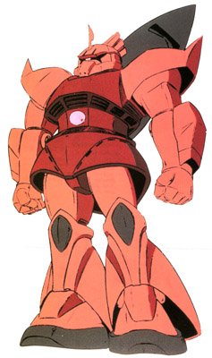 The Gelgoog is the Zeon's firm and deadly response to mass-produced RGM-79 GMs employed by the Federation. It is extremely fast and maneuverable, and arms a number of powerful weapons. Due to its ingenious universal hand plug, it can use virtually any Zeon or Federal weapon. Its standard armament includes a powerful and highly accurate beam rifle, more or less the same as the RX-78 Gundam's, a beam saber, and a large shield, capable of covering its entire body. Two verniers equipped in the Gelgoogs forearms can be removed for heavy 110mm machineguns for ground combat. The Gelgoog is extremely mobile, powered by nine (seventeen in the case of the High Mobility Variant) large thrusters. Numerous apogee motors and other jets stipple its body, giving it unprecedented maneuvering ability. It is also decently well armored, though still not quite as tough as the Lunar-titanium equipped Gundam. The Gelgoog is also very customizeable, being able to quickly switch between a standard armament, a fuel-guzzling high mobility variant, or an anti-battleship cannon variant. A removable backpack is the only exchanged feature. The Gelgoog's main weakness is not a design flaw, but rather its extremely high operating cost. Gelgoogs are high maintainence machines that use large amounts of fuel extremely quickly, and it remains unclear whether or not the Zeon will be able to continue their usage with their dwindling resources. Zeon designs typically include a limited production Commander S type unit, which tends to include additional thruster and sensor capacity. |