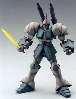 With its abilities focused mostly around close combat, the Gyan was reasonably quick and nimble, and boasted heavier armor than most Zeon mobile suits. While it did not have any internal armaments or a reactor strong enough to power an actual beam rifle, a number of armaments were created specifically with the Gyan in mind. A large beam sword, with a higher power output and wider "blade" than the best Federation beam sabers, as well as a special shield that armed a flotilla of short range missiles that were very powerful, but compact enough to hide in the Gyans inconspicuous shield. While it was chiefly designed for close combat, the Gyan could make use of medium range machineguns and shotguns. However, it was designed to work in tandem with Rick Doms, charging into the enemy lines while the faster and more heavily armed Doms provided fire support. Much like the Gelgoog, the Gyan could be refitted as needs arose, simply by exchanging the units backpack. A high thrust HMT model equipped with external fuel tanks was the primary variant, though a more heavily armed Cannon model with twin ballistic shoulder cannons could be used in an emergency. In the end the Gelgoog won Zeons second generation mobile suit contract, and only a handful of Gyan models were made. |