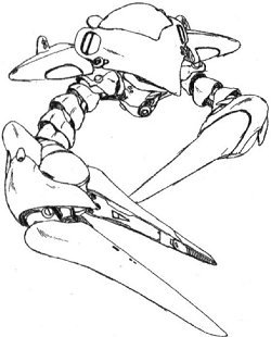 The MA-06 Val Varo proved to be this mobile armor. Based off of the Bigro's design, the Val Varo placed more emphasis on maneuverability and speed than on heavy firepower. Its body was longer but less tall than the Bigro's, giving it a smaller target silhouette from head-on. Again, two large claws were maintained to assist with the Active Mass-and-Balance Auto-Control (AMBAC) system to provide superior mobility. A large mega particle cannon is mounted under the Val Varo's nose; similar in configuration, it sports a higher rate of fire than the Bigro's main gun, though it sacrifices some of its damage output. A pair of large bore missile launchers are positioned at the rear of the Val Varo's stubby wings, and quadruple vulcan guns are mounted further back on the underside of the main body. In addition to a pair of concealed anti-aircraft mega particle guns, the Val Varo also equips a modified version of the MAX-03 Adzam's leader weapons. Rather than wires, the Val Varo's version uses a plasma array to deliver a blistering electrical charge against multiple targets, making it a highly effective unit to deal with massed enemy attacks. Additionally, its thick, sloping armor renders it nearly impervious to small arms fire from all but the closest range. Alltogether, it is an ideal mobile armor for fighting mobile suits; however, warships are still best left to its older brother, the Bigro. |