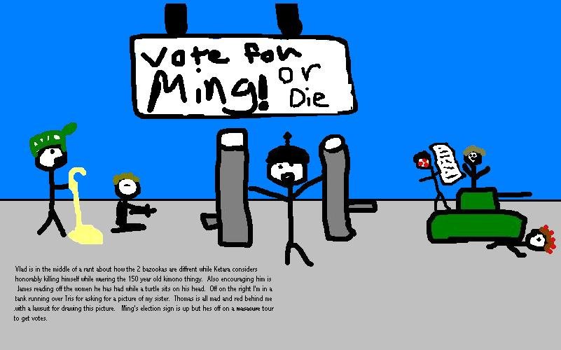A long long time ago, Marcus used to have these big, giant games with like, 170 members. And as people naturally have a need to express themselves artistically, they gave him pictures, and songs, and AMV's, and suchforth and so on, and he put them up on a member art page. This page is the continuation of that page. So, if you're bored, send me your poetry, your songs, your pictures, your yadda and your yadda. I've got my entry up there. Who knows, I may just pay you for it. ~Eldoreth Marching song of the Duchy of Zeon Author: Eldoreth Mimic of: Simpsons - Stonecutters Who gasses colonies every day? Who mass produces the solar ray? WE DO! WE DO! Who keeps the Titans off the maps? Who keeps the Earthnoids under raps? WE DO! WE DO! Who holds back Gundarium? Who laughs when Amuro sucks his thumb? WE DO! WE DO! Who likes being Ghirens pawn? Who wakes up to Seig Zeon? WE DO! WE DOOOOOOOO! Vote For Ming! Artist: Dan OYW banner-ness! Artist: Jojo Operation Desert Oil! Artist: Jojo Tribes Head! Artist: Marcus The quality is in the waiting. Artist: Vlad |