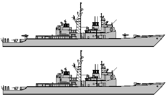 Unit type: destroyer Operator: Earth Federation Navy Dimensions: overall length 171 meters, overall width 16 meters Weight: 7103 tons empty, 9957 tons maximum Powerplant: 4 x P&W Roice gas turbine, 80,000 shaft horsepower Propulsion: 2 x screw, 4 blades each Performance: cruising speed 28 knots, maximum speed 33 knots Hangar capacity: 2 aircraft Launch catapults: 0 Armaments: 2 x 130mm cannon; 2 x 61-tube multipurpose vertical launch missile system; 2 x 4-tube missile launcher; 4 x antiground machine gun; 4 x antiaircraft machine gun; 2 x 3-tube torpedo launcher |